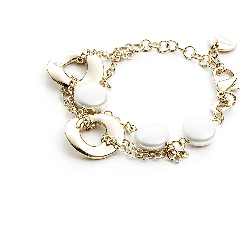 Bracciale Da Donna 4Us Cesare Paciotti Della Collezione White Pearl 4UBR3658W. Gioiello Realizzato In Ottone Con Galvanica Di Colore Oro E Perle Bianche. Lunghezza: 15 Cm + 5 Cm Di Riduzione. Chiusura A Pappagallo.