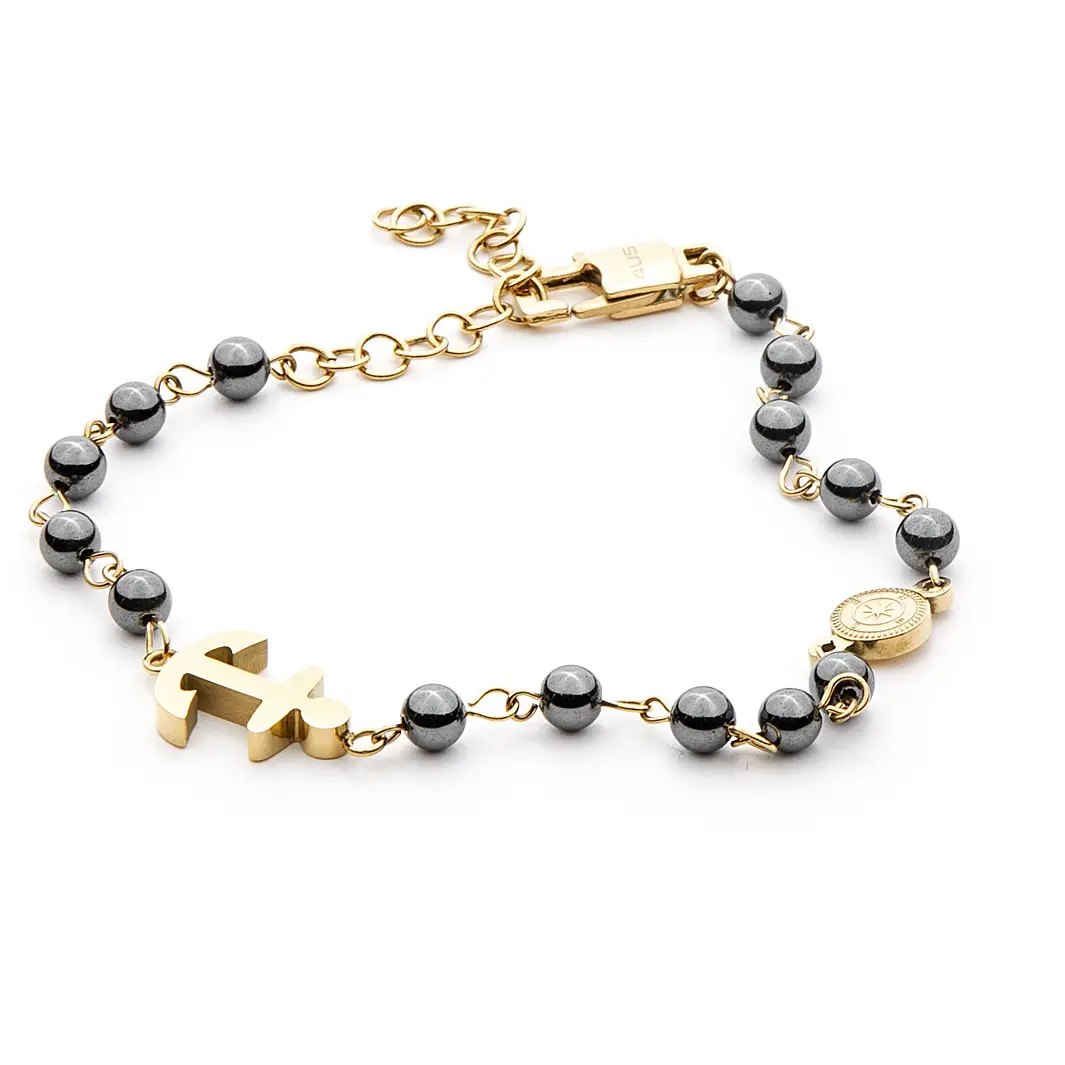 Bracciale con simbolo ancora realizzato in acciaio ed ematite con finitura PVD oro. Misura sfera sfaccettata: 4 mm. Lunghezza bracciale: 18 cm + 4 cm di estensione.