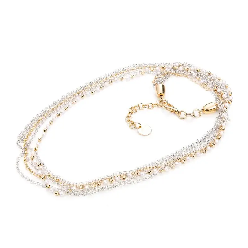 Collana con perline realizzata in ottone con finitura in acciaio e PVD oro. Lunghezza collana: 60 cm + 5 cm di estensione. Chiusura con moschettone.