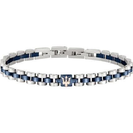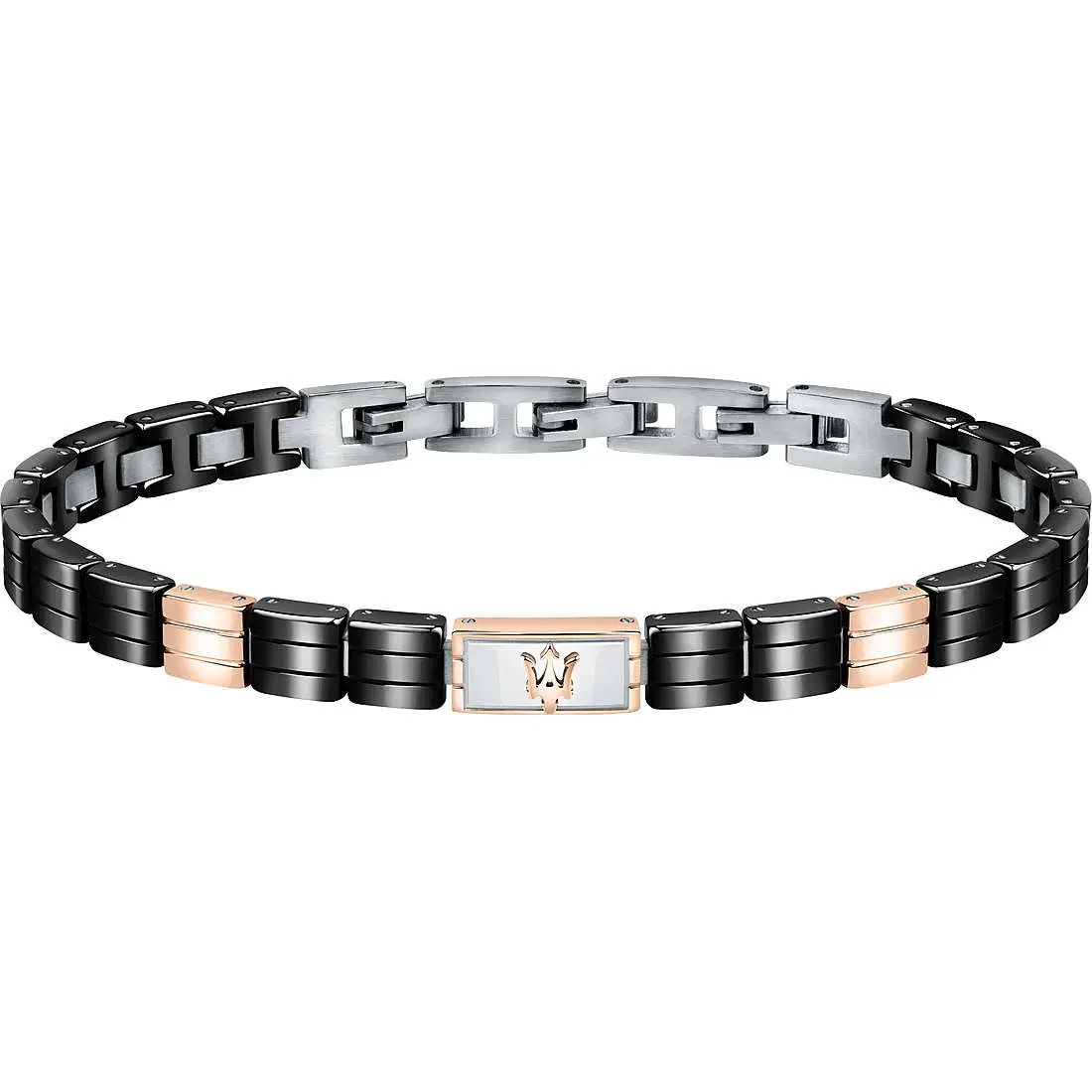 Bracciale Uomo Maserati Jewels – JM221ATZ05 realizzato in acciaio 316L anallergico. A maglia con ceramica nera e pvd oro rosa, impreziosito dal simbolo del tridente Maserati al centro. Chiusura a clip. La misura del gioiello รจ 22 cm.