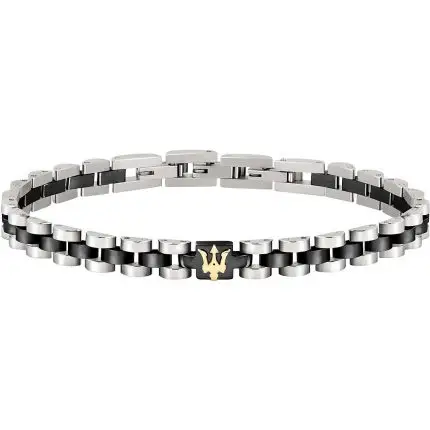 Bracciale Uomo Maserati Jewels – JM221ATY07 realizzato in acciaio 316L anallergico. La maglia in colore acciaio presenta una targhetta dorata pvd oro giallo e simbolo del tridente Maserati al centro, impreziosita da diamanti naturali selezionati. Chiusura con moschettone con logo Maserati. La misura del gioiello รจ 22 cm.