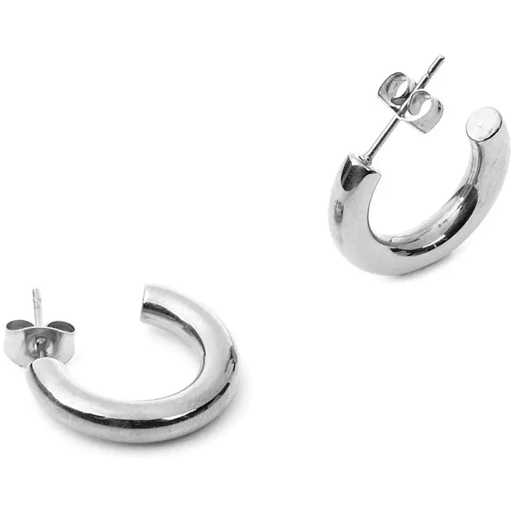 Orecchini a cerchio, realizzati in Acciaio 316L con finitura acciaio. Diametro esterno: 20 mm.