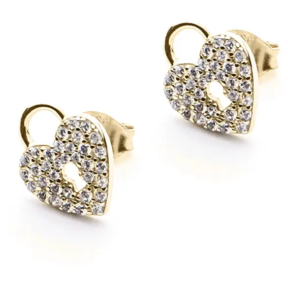 Orecchini cuore a lucchetto, realizzati in Argento 925 e zirconi con finitura PVD oro.
