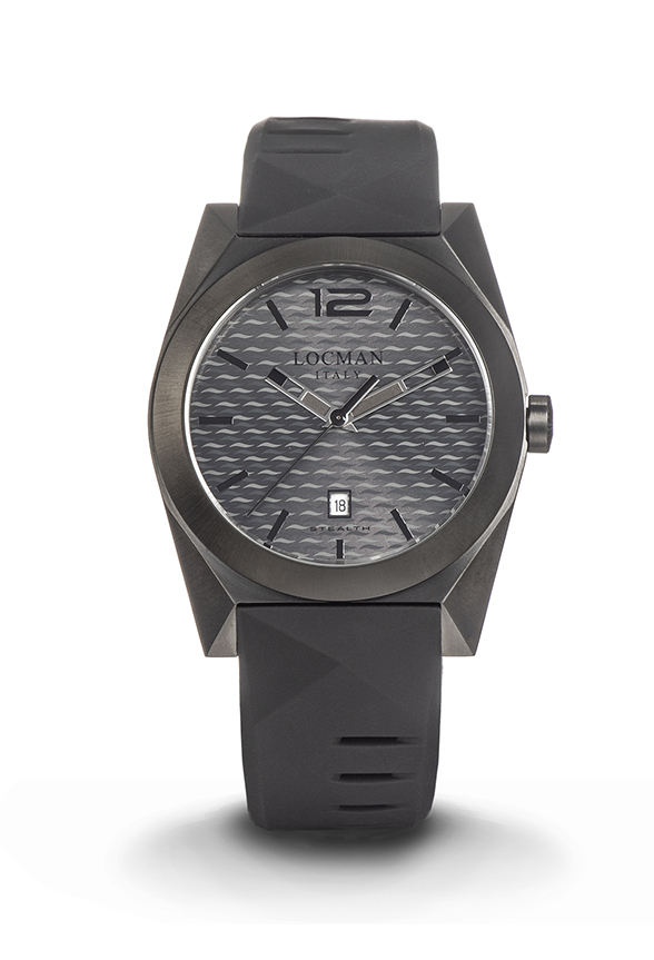 Il quadrante รจ decorato con un motivo a onde. Il vetro di protezione รจ trattato per ottenere una durezza, una resistenza ai graffi e una trasparenza pressochรฉ pari a quelle del vetro zaffiro. Il cinturino รจ in silicone anallergico, ottenuto da stampi in platino e colorato con tinture rigorosamente vegetali. Locman Stealth รจ disponibile in versione solo tempo oppure cronografo, entrambe equipaggiate da movimenti al quarzo. In posizione di riposo, la lancetta dei minuti crono รจ sfalsata di 90ยฐ rispetto allโasse verticale e indica la parola โzeroโ.